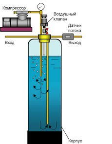 Пузырьки воздуха проникают через слои жидкости, потом воздушный клапан излишний воздух стравливает. Таким образом, осуществляется естественное насыщение кислородом воды. Аэрационные колонны могут применяться самостоятельно, либо как составная часть различных систем очистки воды.